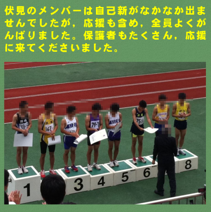 暑い中,コンディション調整も難しく,伏見のメンバーは自己新がなかなか出ませんでしたが,応援も含め,全員よくがんばりました。保護者もたくさん,応援に来てくださいました。