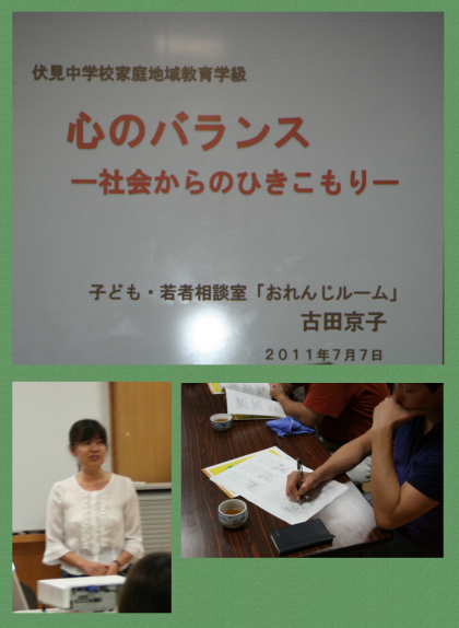 7月7日(木)伏見地域生徒指導連絡協議会が主催する第1回家庭地域教育学級が本校ふれあいルームで行われました。今回の講師の先生は子ども・若者総合相談室『オレンジルーム』のキャリアコンサルタントをしておられる古田京子氏。【心のバランス〜社会からのひきこもり〜】の演題で,約1時間半ほどのご講演をしていただきました。ひきこもりの現状や本人・保護者の思い,地域の理解・支援などについて貴重なお話しを伺いました。