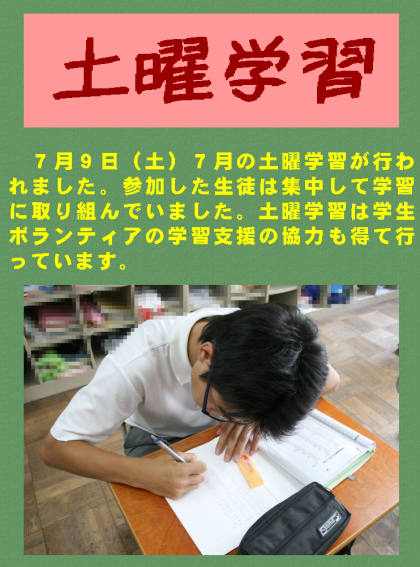 7月9日(土)7月の土曜学習が行われました。参加した生徒は集中して学習に取り組んでいました。土曜学習は学生ボランティアの学習支援の協力も得て行っています。