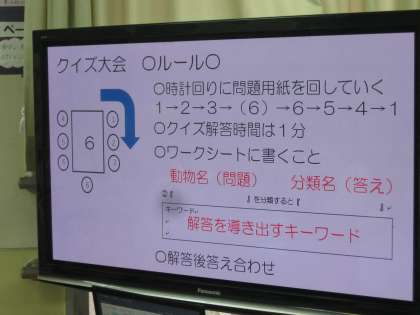 生物分野の学習として行われたこの授業は、各自が動物の名称と答え(分類)を前もって設定し、解答につながるヒントを今までの学習内容や準備された図書資料から導き出す内容でした。限られた時間で資料収集を行った2年生は、最後の場面でグループごとにヒントとなったキーワードをもとに、解答を行っていました。今までの教室での学習が、図書館を使うことでさらに深化したものになったようです。