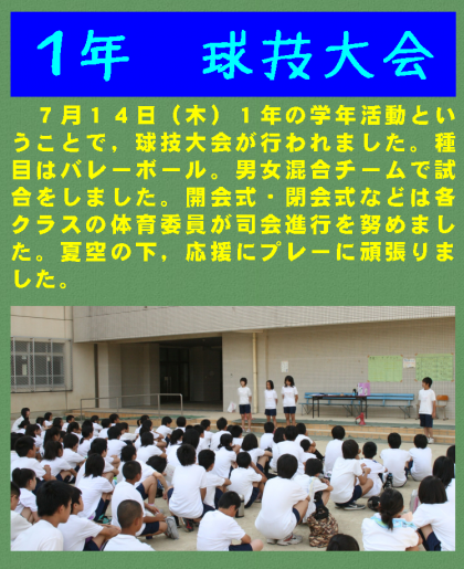7月14日(木)1年の学年活動ということで,球技大会が行われました。種目はバレーボール。男女混合チームで試合をしました。開会式・閉会式などは各クラスの体育委員が司会進行を努めました。夏空の下,応援にプレーに頑張りました。