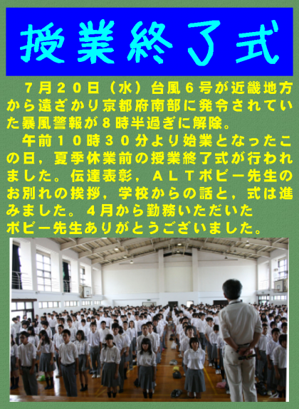 7月20日(水)台風6号が近畿地方から遠ざかり京都府南部に発令されていた暴風警報が8時半過ぎに解除。午前10時30分より始業となったこの日,夏季休業前の授業終了式が行われました。伝達表彰,ALTボビー先生のお別れの挨拶,学校からの話と,式は進みました。4月から勤務いただいたボビー先生ありがとうございました。