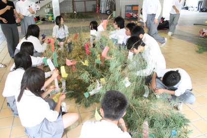 7月1日(水)の放課後,文化委員の生徒たちがクラスメイトが作った短冊を笹に飾り付けてくれました。一人一つの短冊に自分の願いを託していました。