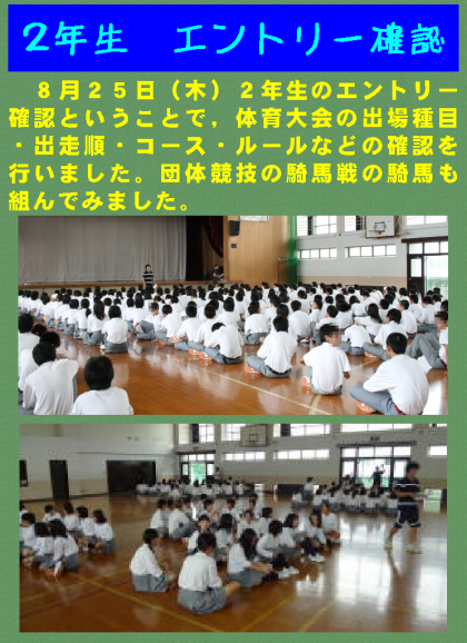 8月25日(木)2年生のエントリー確認ということで,体育大会の出場種目・出走順・コース・ルールなどの確認を行いました。団体競技の騎馬戦の騎馬も組んでみました。