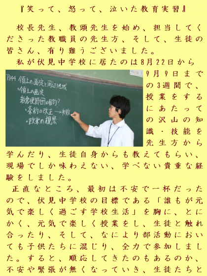 私が伏見中学校に居たのは8月22日から9月9日までの3週間で、授業をするにあたっての沢山の知識・技能を先生方から学んだり、生徒自身からも教えてもらい、現場でしか味わえない、学べない貴重な経験をしました。正直なところ、最初は不安で一杯だったので、伏見中学校の目標である「誰もが元気で楽しく過ごす学校生活」を胸に、とにかく、元気で楽しく授業をし、生徒と触れ合ったり、そして、なにより部活動においても子供たちに混じり、全力で参加しました。すると、順応してきたのもあるのか、不安や緊張が無くなっていき、生徒たちと触れ合っている自分がそこにはいました。