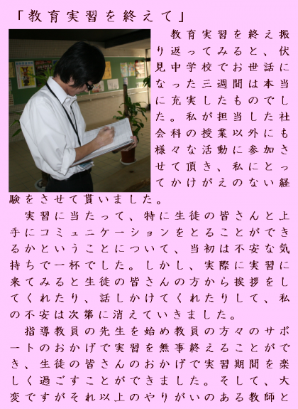 教育実習を終え振り返ってみると、伏見中学校でお世話になった三週間は本当に充実したものでした。私が担当した社会科の授業以外にも様々な活動に参加させて頂き、私にとってかけがえのない経験をさせて貰いました。