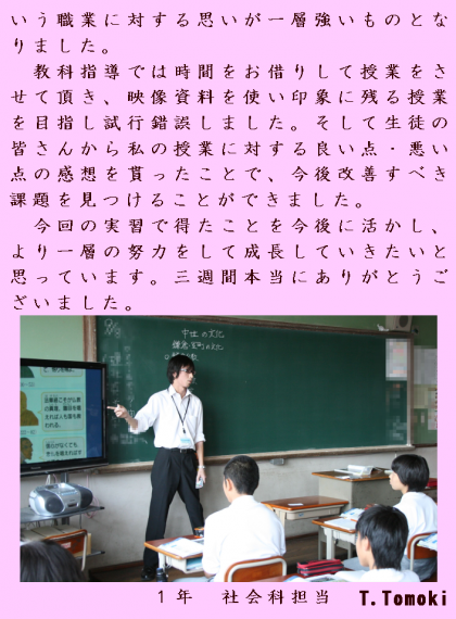 指導教員の先生を始め教員の方々のサポートのおかげで実習を無事終えることができ、生徒の皆さんのおかげで実習期間を楽しく過ごすことができました。そして、大変ですがそれ以上のやりがいのある教師という職業に対する思いが一層強いものとなりました。