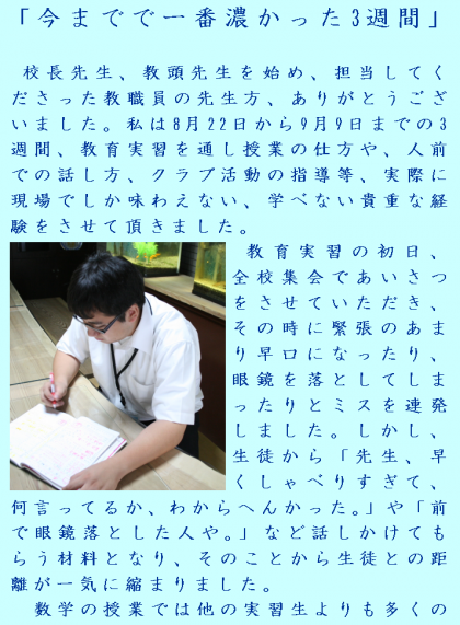 校長先生、教頭先生を始め、担当してくださった教職員の先生方、ありがとうございました。私は8月22日から9月9日までの3週間、教育実習を通し授業の仕方や、人前での話し方、クラブ活動の指導等、実際に現場でしか味わえない、学べない貴重な経験をさせて頂きました。