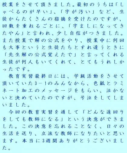 今回の教育実習を通して「どんな遠回りをしても教師になる」という決意ができました。この決意を忘れることなく、日々の生活を送り、立派な教師になりたいと思います。本当に3週間ありがとうございました。