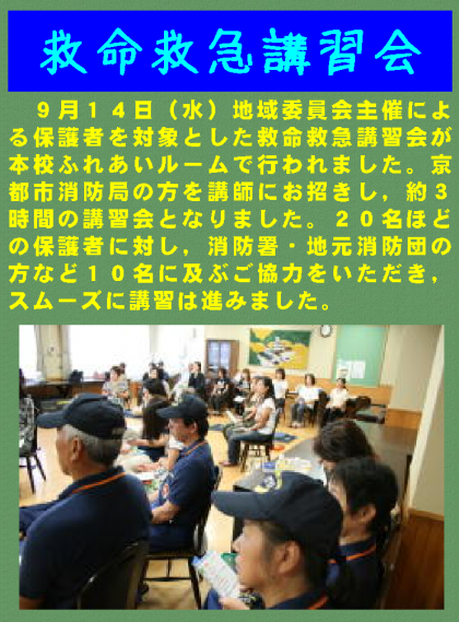 9月14日(水)地域委員会主催による保護者を対象とした救命救急講習会が本校ふれあいルームで行われました。京都市消防局の方を講師にお招きし,約3時間の講習会となりました。20名ほどの保護者に対し,消防署・地元消防団の方など10名に及ぶご協力をいただき,スムーズに講習は進みました。
