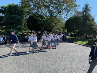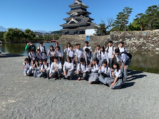 12:50頃、予定通りの時間に松本城周辺に到着。天気は快晴。サラッとした空気に、綺麗な街並み、みんなワクワクしています。お城をバックに学級写真を撮影し、班別研修へ出発です!