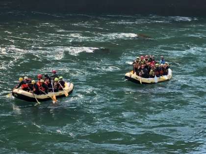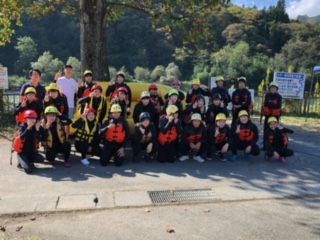しっかり安全講習を受け、ラフティングがスタートしました。「せーの!」の掛け声でパドルをみんなでこぎます。がんばれ、がんばれ!