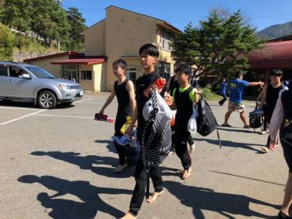 約1時間にも渡るラフティングを経験し、マイクロバスでスタート地点へ戻ってきた生徒たち。皆、とてもいい顔をしています。お天気にも恵まれて、良い経験ができたようです。シャワーを浴びて着替えたら、お天気の下、カレーを食べます。元気に友人との時間を満喫しております!!