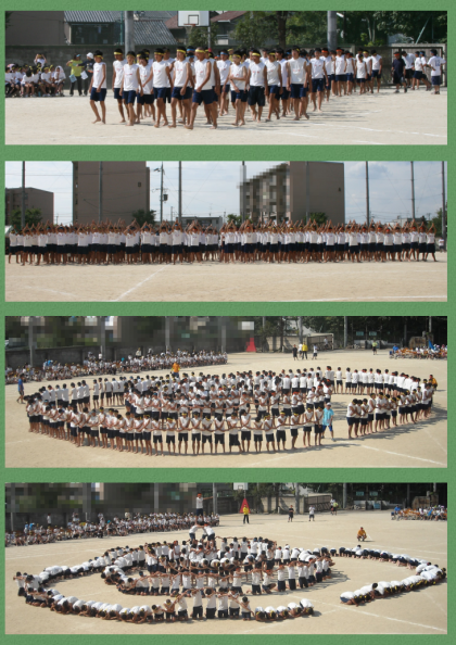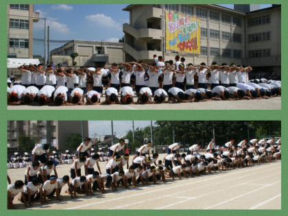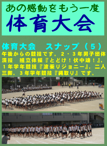 午後からの競技です。2・3年男子団体演技 組立体操『とどけ!伏中魂!』,1年学年競技『波乗りジョニー』,二人三脚,3年学年競技『縄取り』です。