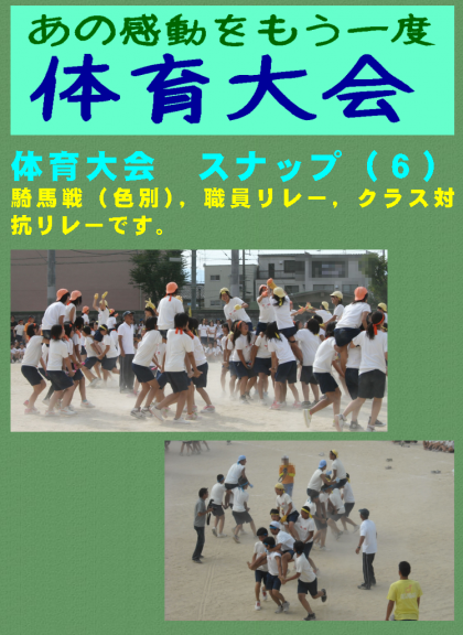 騎馬戦(色別),職員リレー,クラス対抗リレーです。