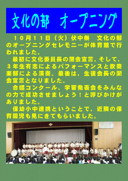 10月11日(火)伏中祭 文化の部のオープニングセレモニーが体育館で行われました。最初に文化委員長の開会宣言,そして,3年生有志によるパフォーマンスと吹奏楽部による演奏。最後は,生徒会長の閉会宣言となりました。合唱コンクール,学習発表会をみんなの力で成功させましょう!と呼びかけがありました。保幼小中連携ということで,近隣の保育園児も見にきてもらいました。