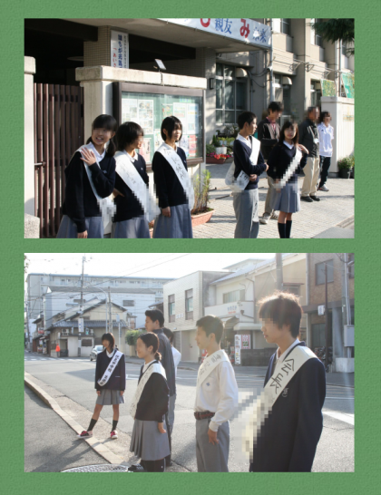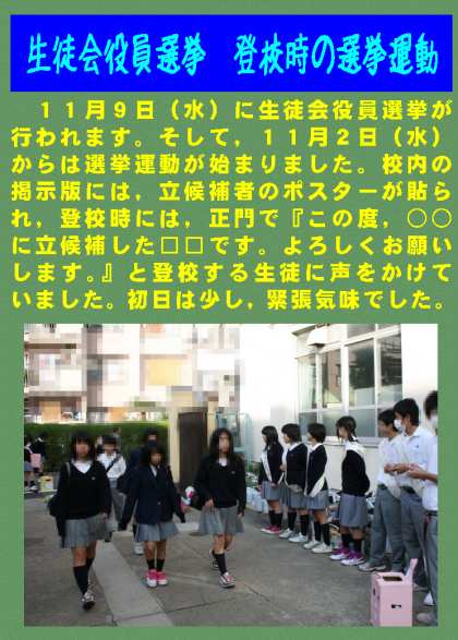 11月9日(水)に生徒会役員選挙が行われます。そして,11月2日(水)からは選挙運動が始まりました。校内の掲示版には,立候補者のポスターが貼られ,登校時には,正門で『この度,○○に立候補した□□です。よろしくお願いします。』と登校する生徒に声をかけていました。初日は少し,緊張気味でした。