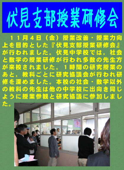 11月4日(金)授業改善・授業力向上を目的とした『伏見支部授業研修会』が行われました。伏見中学校では,社会と数学の授業研修が行われ多数の先生方が来校されました。1時間の研究授業のあと,教科ごとに研究協議会が行われ研修を深めました。本校の社会・数学以外の教科の先生は他の中学校に出向き同じように授業参観と研究協議に参加しました。