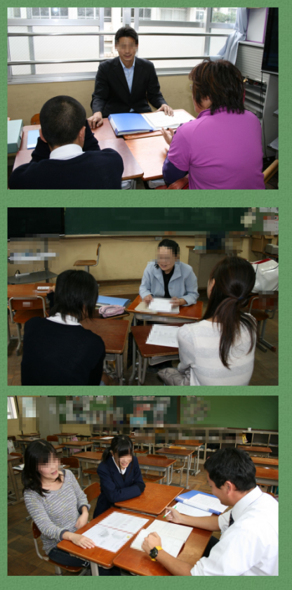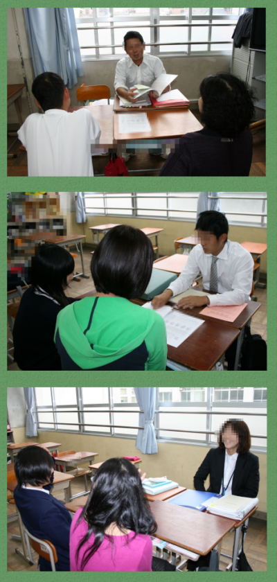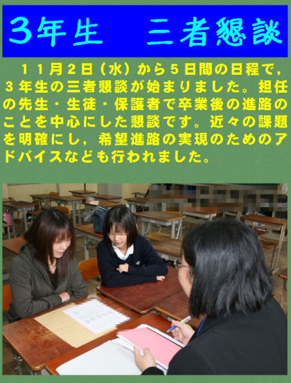 11月2日(水)から5日間の日程で,3年生の三者懇談が始まりました。担任の先生・生徒・保護者で卒業後の進路のことを中心にした懇談です。近々の課題を明確にし,希望進路の実現のためのアドバイスなども行われました。