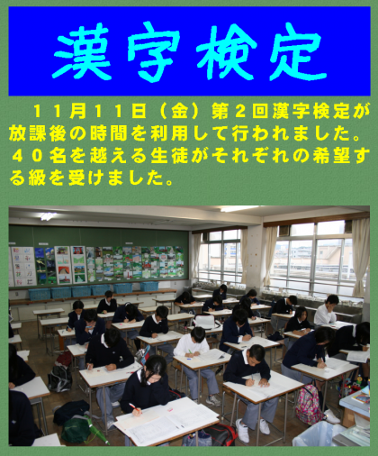 11月11日(金)第2回漢字検定が放課後の時間を利用して行われました。40名を越える生徒がそれぞれの希望する級を受けました。