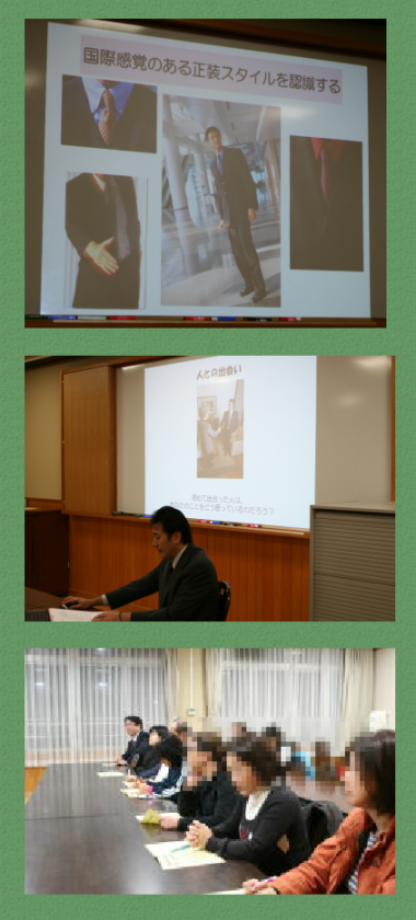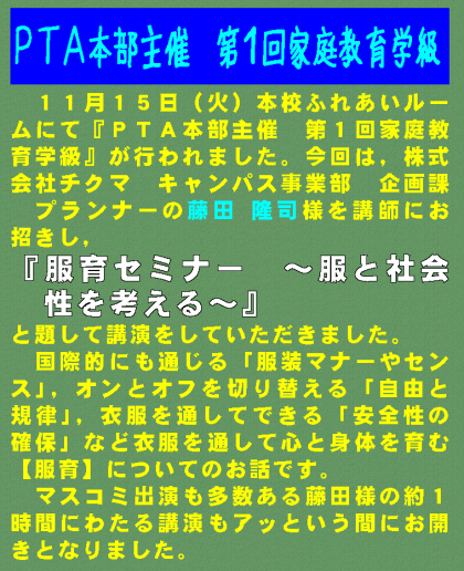 11月15日(火)本校ふれあいルームにて『PTA本部主催 第1回家庭教育学級』が行われました。今回は,株式会社チクマ キャンパス事業部 企画課 プランナーの藤田 隆司様を講師にお招きし,『服育セミナー 〜服と社会性を考える〜』と題して講演をしていただきました。国際的にも通じる「服装マナーやセンス」,オンとオフを切り替える「自由と規律」,衣服を通してできる「安全性の確保」など衣服を通して心と身体を育む【服育】についてのお話です。マスコミ出演も多数ある藤田様の約1時間にわたる講演もアッという間にお開きとなりました。
