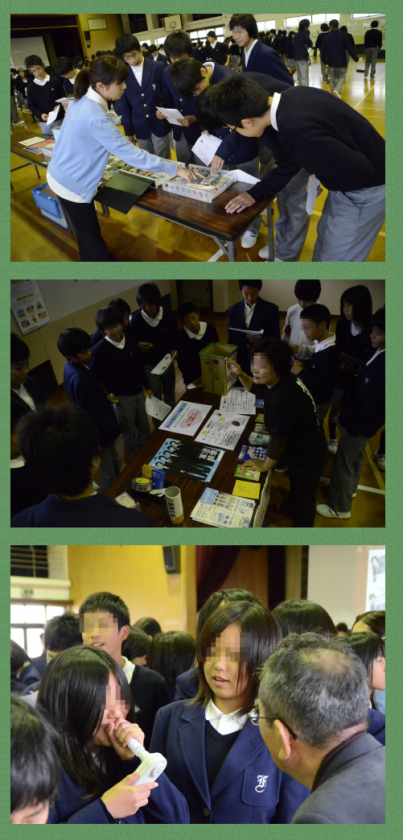 11月18日(金)2年生を対象とした『体験型防煙教室』が行われました。この防煙教室は,京都府医師会,NPO法人京都禁煙推進研究会,京都府立医科大学との共催で実施されています。歯科衛生士の方,看護師の方,医学部の学生さんなど数多くの方に講演をしていただきました。その後,体験コーナーで,学習を深めました。