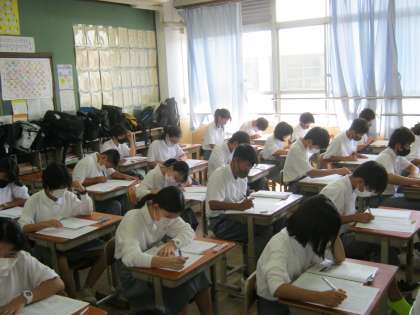 3連休明けの本日より,第3回テストがスタートしました。まだまだ暑い中,みんな真剣にテストに取り組んでいます。今までやってきたテスト勉強の結果がしっかり出せるよう2日間体調管理にも気をつけて,最後まであきらめずに頑張っていほしいです。
