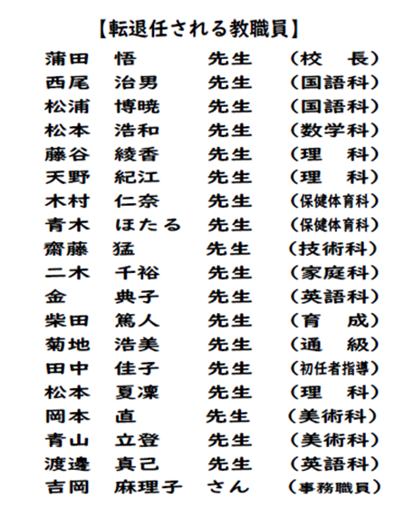 なお, 離任式は3月30日(木)11:00〜行う予定です。