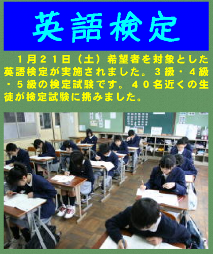 1月21日(土)希望者を対象とした英語検定が実施されました。3級・4級・5級の検定試験です。40名近くの生徒が検定試験に挑みました。