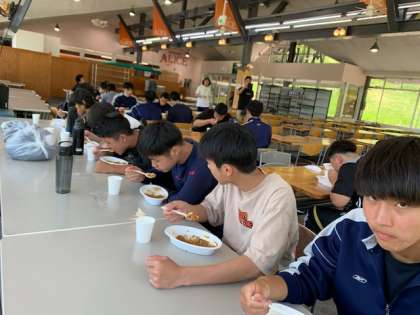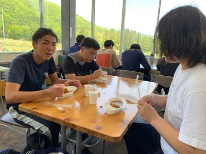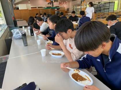 午前の体験学習が終わり、白馬47に移動。体をしっかり動かして、お腹ペコペコ。カレーが進みます!