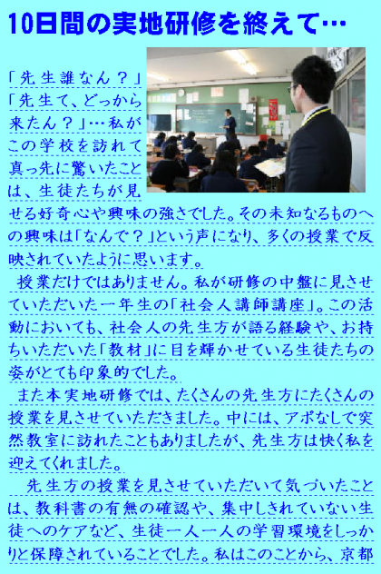 また本実地研修では、たくさんの先生方にたくさんの授業を見させていただきました。中には、アポなしで突然教室に訪れたこともありましたが、先生方は快く私を迎えてくれました。