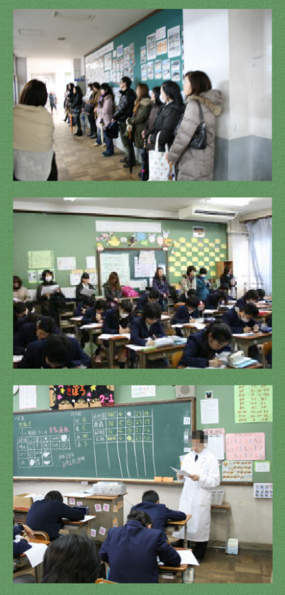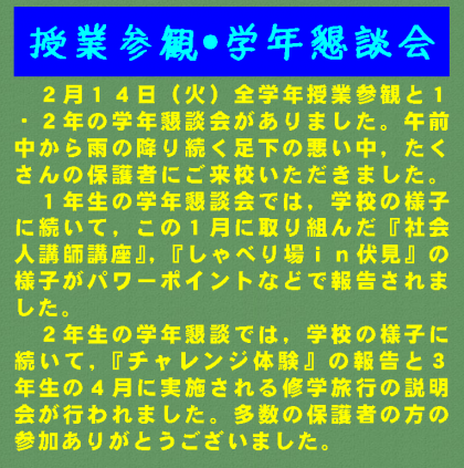 2月14日(火)全学年授業参観と1・2年の学年懇談会がありました。午前中から雨の降り続く足下の悪い中,たくさんの保護者にご来校いただきました。1年生の学年懇談会では,学校の様子に続いて,この1月に取り組んだ『社会人講師講座』,『しゃべり場in伏見』の様子がパワーポイントなどで報告されました。2年生の学年懇談では,学校の様子に続いて,『チャレンジ体験』の報告と3年生の4月に実施される修学旅行の説明会が行われました。多数の保護者の方の参加ありがとうございました。