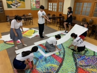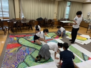 本日の放課後,生徒会本部を中心に大壁画の貼り合わせ作業が行われました。夏休み明けに一人ひとりが作成したピースを丁寧に貼り合わせてくれました。生徒の皆さんには完成したものを,近々お披露目することになると思います。ぜひ,楽しみにしておいてください。