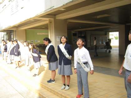 10月19日(木)朝の様子です。10月25日(水)に行われる生徒会立会演説会・選挙に向けて立候補者の選挙運動が今日から始まりました。立候補の手続きを済ませ、この選挙運動に向けて準備を進めてきた立候補者。元気な声で挨拶する姿からは、それぞれの意気込みが感じられました。この調子で選挙当日まで頑張ってほしいと思います。