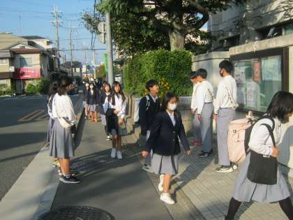11月2日(木)朝の登校の様子です。11月に入り朝晩は寒くなってきましたが、日中は気温も上がり、過ごしやすい日が続いています。登校時には、生徒会の本部役員、生活委員会が元気に挨拶をしてくれています。旧生徒会の3年生も今日が最後の挨拶当番となりました。これからは新生徒会のメンバーが中心となります。