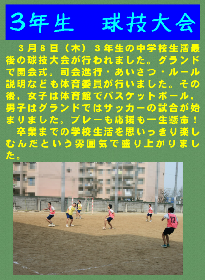 3月8日(木)3年生の中学校生活最後の球技大会が行われました。グランドで開会式。司会進行・あいさつ・ルール説明なども体育委員が行いました。その後,女子は体育館でバスケットボール,男子はグランドではサッカーの試合が始まりました。プレーも応援も一生懸命!卒業までの学校生活を思いっきり楽しむんだという雰囲気で盛り上がりました。