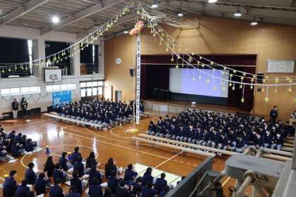 3年生からは、合唱「群青」のお返しがあり、全学年、教職員で聞き入っていました。3年生の素晴らしい合唱や在校生へ向けたメッセージを受け、これからの「伏見中」を輝かしてくれることでしょう。3年生が退場したあと、3年生の先生方から、生徒会本部役員を中心とした在校生のみなさんに感謝の言葉をいただきました。今年度、全校生徒が集う最後の取組に、寒い体育館も熱く盛り上がりました。