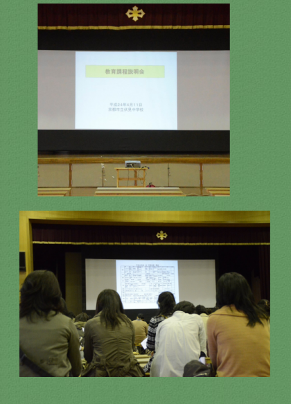 4月11日(水)平成24年度の教育課程説明会がと花背山の家保護者説明会が体育館で行われました。お昼の時間帯で体操服とジャージの販売があり,その続きで,説明会が行われました。生憎の雨天の中,お忙しい時間にも関わらず,100名近くの保護者の方の参加がありました。今年度から完全実施となる新指導要領を中心に伏見中学校の教育課程の説明があり,その後,4/19(木)・20(金)の一泊二日で行われる花背山の家宿泊学習の説明会が行われました。この宿泊学習が学年の良いスタートを切れる行事となって欲しいものです。