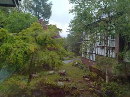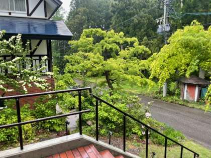 2日目の朝を迎えました。皆さんしっかりと眠れたでしょうか。ペンションからの眺めです。昨晩から雨で、現在も少し降っているようです。今日はラフティングをはじめとする体験学習があります。体験学習が始まる頃からは天候も回復する予報です。今日も精一杯活動してください。