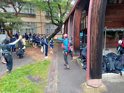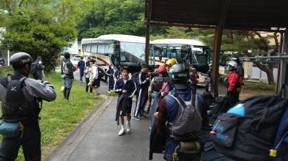 会場に到着しました。各バスでウェットスーツの着用の仕方の説明を聞き、ウェットスーツを受け取り、着替え開始です。