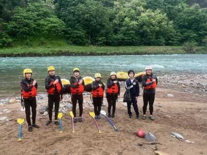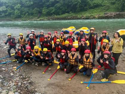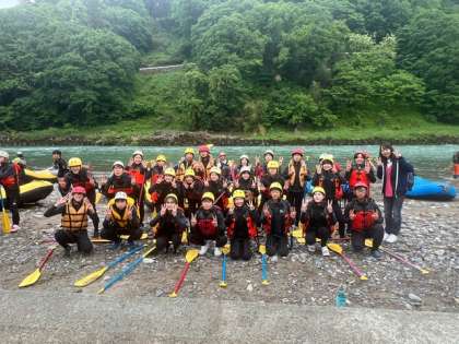 学級写真を撮って、いよいよインストラクターさんの説明を受け、ラフティングがスタートしました。昨晩の雨で少しだけ普段より流れが急ですがみんな楽しそうです。