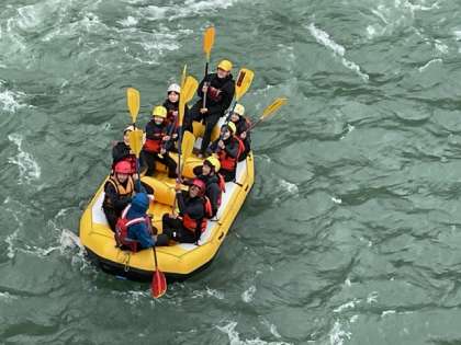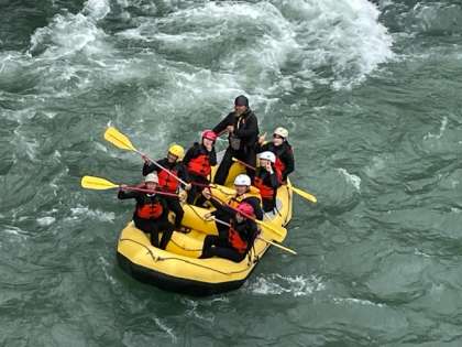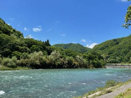 後半はかなり晴れてきました。ラフティング体験が終われば、犀川沿いにて、昼食のカレーをいただきます。