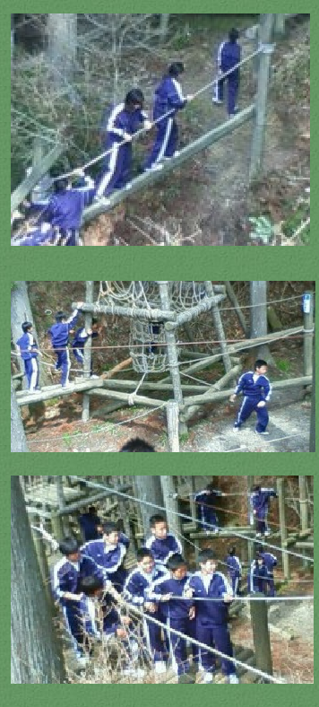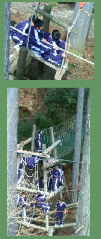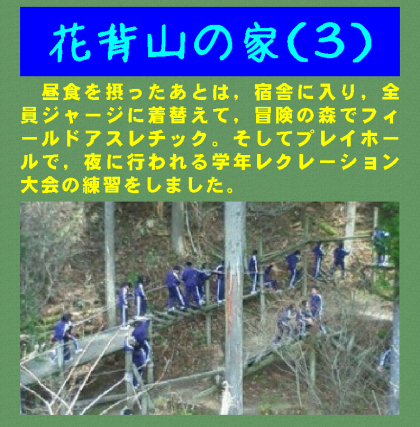 昼食を摂ったあとは,宿舎に入り,全員ジャージに着替えて,冒険の森でフィールドアスレチック。そしてプレイホールで,夜に行われる学年レクレーション大会の練習をしました。.