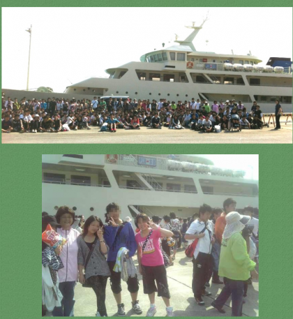 2日目は,本当に良いお天気となりました。生徒達も随分日焼けしたようです。伊江港で退村式を行い,一泊二日お世話になった伊江島ともお別れです。お別れの言葉は『さよなら』ではなく『いってらっしゃい』です。是非,また,行きたいです。フェリーに乗り込み,伊江島のおじい・おばあと別れを告げ,本島に向かいます。・