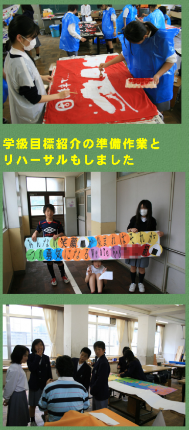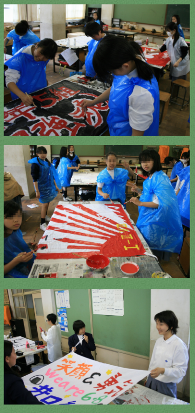 4月27日(金)家庭訪問が始まった日から放課後の時間を使って,学級のシンボルとなる学級旗の作成が始まりました。学級旗の作成が初めての1年生は,通学服に絵の具がつかないようにご覧の通りの格好となりました。完成までもうしばらくかかるようです。