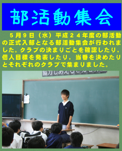 5月9日(水)平成24年度の部活動の正式入部となる部活動集会が行われました。クラブの決まりごとを確認したり,個人目標を発表したり,当番を決めたりとそれぞれのクラブで集まりました。