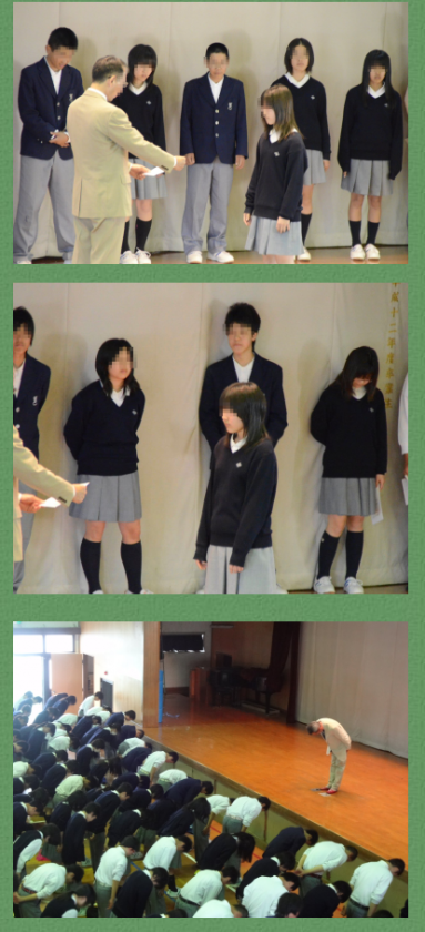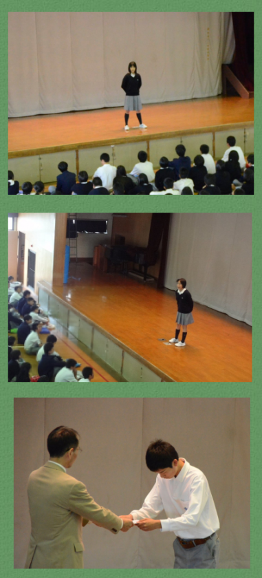 5月10日(木)平成24年度の前期学級役員の認証式が体育館で行われました。全クラスを代表して3年生の1学級が校長先生から認証状を受け取りました。その後,生徒会長から,しっかりと委員の責任と自覚をもって頑張りましょうと発表がありました。また,文化委員長からエコキャップ回収運動に協力してくださいと呼びかけがありました。認証式の前には,春季総合体育大会の伝達表彰も行われました。