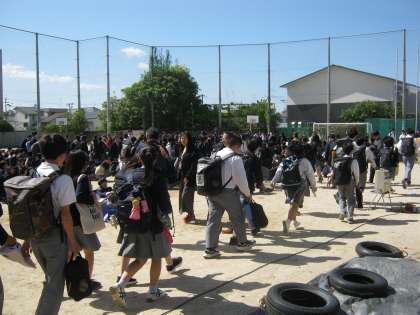 14時35分、地震発生に伴い、北校舎東に亀裂を確認したという想定の下、全校生徒がグランドに移動、人員点呼等の訓練を行いました。全校生徒が真剣な表情で安全かつ迅速に、約5分で避難できました。