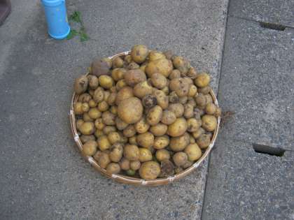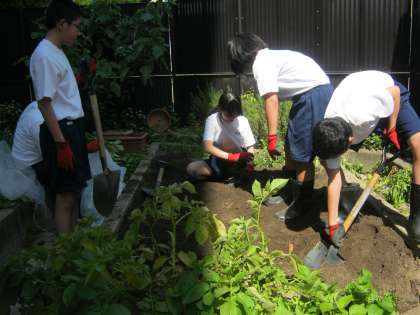 そのような中、9組は6時間目の技術・家庭科の授業で、校舎裏の畑にてジャガイモの収穫を行いました。これまで一生懸命に育ててきたこともあり、たくさんのジャガイモを収穫することができました。