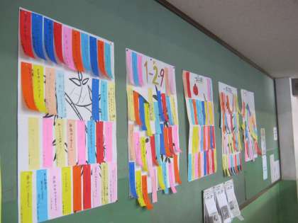 文化委員会が準備してくれた短冊が、各学年のフロアに掲示されています。短冊には「夏季大会ベスト8」「楽しい思い出ができますように」など、さまざまな願いが書かれています。